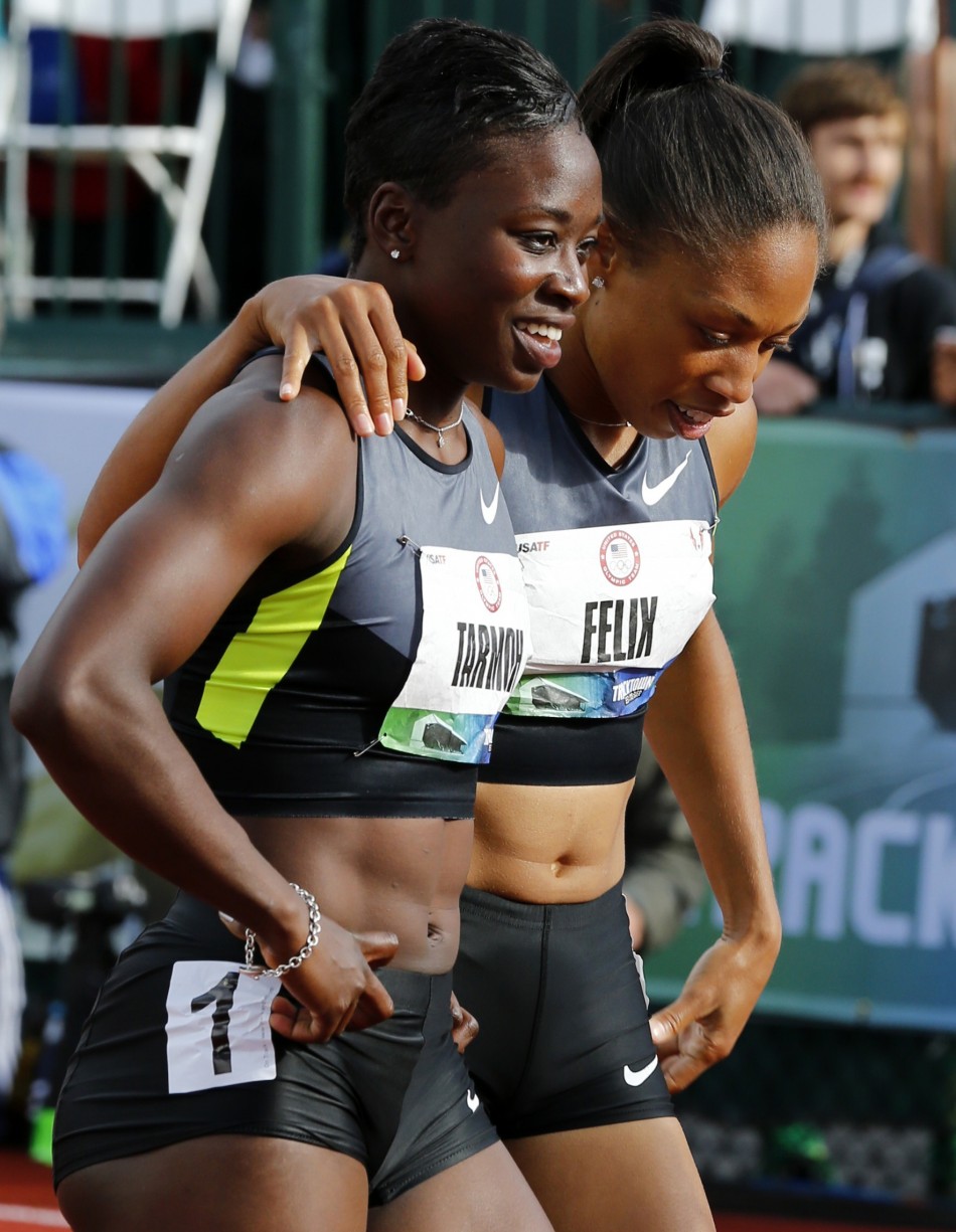 El hecho insólito y sin precedentes en la historia del atletismo de Estados Unidos se produjo cuando Felix y Tarmoh cruzaron la línea tan juntas que ni siquiera al 'photo finish' logró establecer cual de las dos entró por delante.